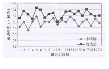由圖5可以看出,用微波等離子清洗過的電路的鍵合引線焊接強度好于未清洗的電路。這主要是因為清洗能夠清除鍵合指鍍金層表面的微小污物,減小鍍金層表面浸潤角,有效改善焊接面浸潤性,增強焊接材料的互融,從而有效地增強引線焊接強度。