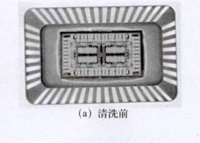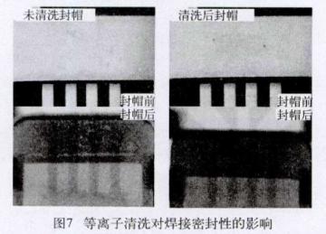封帽前清洗優化焊接面蓋板封帽作為電路陶瓷封裝工藝中的后道關鍵工序,其密封性以及蓋板和焊環的焊接強度直接影響電路的可靠性和使用壽命。取兩只焊環表面有微量沽污的電路,一只用N2/H2,等離子體清洗20min,另一只不作清洗,在同樣的工藝條件下進行合金封帽,最后用x射線檢測焊接面焊接情況。圖7所示為封帽前后的圖片和x射線圖像。