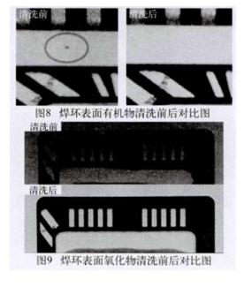 圖8是焊環表面斑點狀的有機物沽污,采用O2等離子體可清除掉,提高了密封焊接面的有效焊接面,減少孔隙的產生。