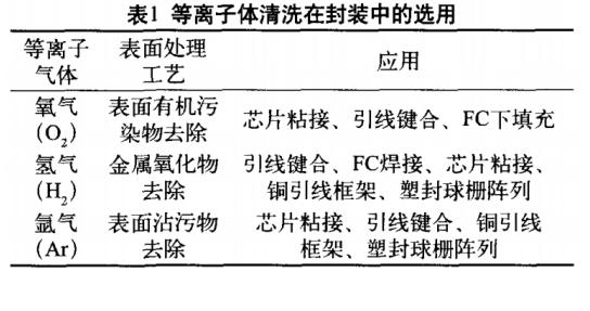 等離子體清洗在半導體封裝領域應用廣泛。根據材料表面氧化、助焊劑殘留、樹脂殘跡、有機物等不同沾污物的性質,選擇相適應的氣體,清除掉這些污染物,從而顯著地改善封裝可制造性、可靠性及提高成品率,表1是等離子體清洗工藝的應用。