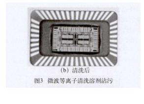 微電子封裝過程中產生的沾污嚴重影響了電子元器件的可靠性和使用壽命。研究表明,微波等離子清洗能有效增強基板的浸潤性,降低芯片和基板共晶焊界面的孔隙率,同時也能清除元件表面的氧化物薄膜和有機物沾污,經過等離子清洗,其鍵合焊接強度和合金熔封密封性都得到提高。
