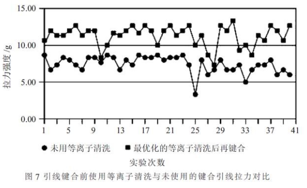 (2)引線鍵合前。芯片粘貼到基板上后,經(jīng)過(guò)高溫固化,其上存在的污染物可能包含有微顆粒及氧化物等,這些污染物從物理和化學(xué)反應(yīng)使引線與芯片及基板之間焊接不完全或粘附性差,造成鍵合強(qiáng)度不夠。在引線鍵合前進(jìn)行射頻等離子清洗,會(huì)顯著提高其表面活性,從而提高鍵合強(qiáng)度及鍵合引線的拉力均勻性。鍵合刀頭的壓力可以較低(有污染物時(shí),鍵合頭要穿透污染物,需要較大的壓力),有些情況下,鍵合的溫度也可以降低,因而提高產(chǎn)量,降低成本。