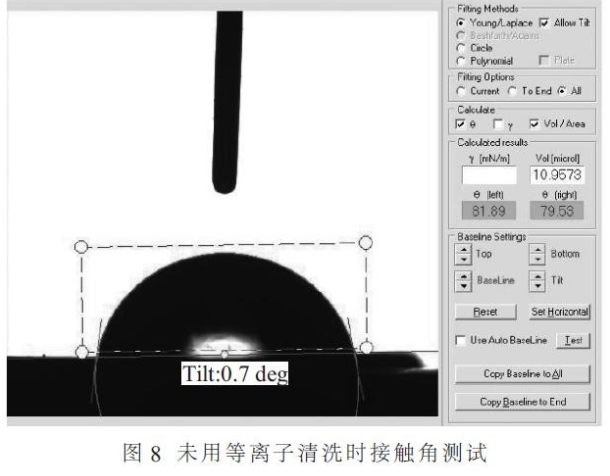 對(duì)LED封裝工藝前添加射頻等離子清洗,測(cè)量鍵合引線的拉力強(qiáng)度,與未進(jìn)行射頻等離子清洗相比,鍵合引線拉力強(qiáng)度有明顯增加,反映基板及芯片進(jìn)行射頻等離子清洗后是否有清洗效果的另一個(gè)檢測(cè)指標(biāo)為其表面的浸潤(rùn)特性,浸潤(rùn)特性的提高表明在封裝工藝前進(jìn)行射頻等離子清洗是十分有益的。